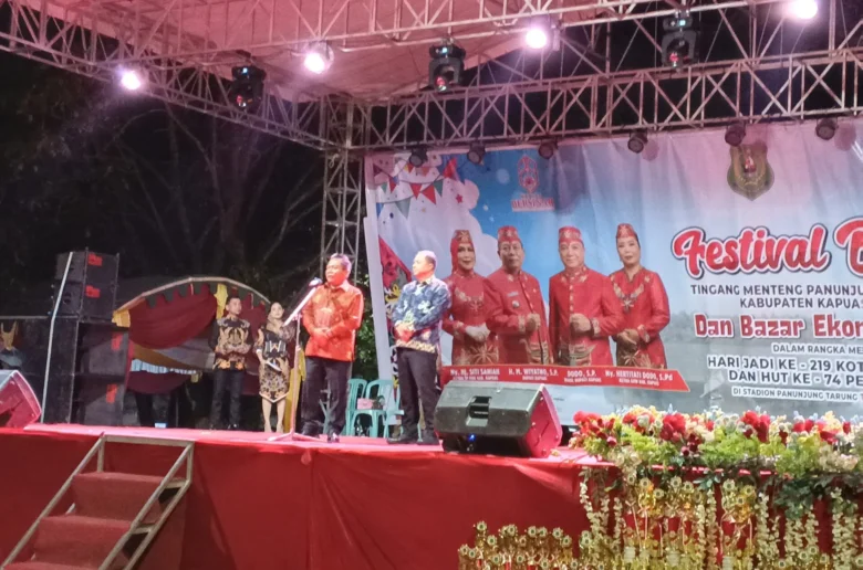 Kuala Kapuas, kontenborneo.com – Festival Budaya Tingang Menteng Panunjung Tarung (TMPT) 2025 yang dilangsungkan di stadion Panunjung Tarung dan masih dalam rangkaian acara peringatan Hari Jadi Kota Kuala Kapuas ke 219 dan HUT Pemerintah Kabupaten Kapuas ke 74, resmi di mulai malam ini Selasa 22/4/2025 setelah di buka secara resmi oleh Bupati Kapuas H. M. Wiyatno, SP, sekitar pukul 18.30 wib yang ditandai dengan pemukulan Garantung (Gong). Selain Bupati Kapuas H. M. Wiyatno yang hadir bersama Ketua TP-PKK Kabupaten Kapuas Ny. Hj. Siti Saniah Wiyatno, di dampingi Wakil Bupati Kapuas Dodo, SP bersama Ny. Hartitati Dodo, juga terlihat hadir antara lain Ketua DPRD Kabupaten Kapuas Ardiansyah, Dandim 1011/KLK Letkol Inf Pamungkas Army Saputro, S.Sos, M.Sc, sejumlah anggota DPRD dan kepala OPD jajaran Pemkab Kapuas, Camat Selat serta tamu undangan lainnya. Bupati Kapuas H M Wiyatno mengawali sambutannya dengan mengucapkan syukur karena cuaca tidak mendung dan sangat bersinar.