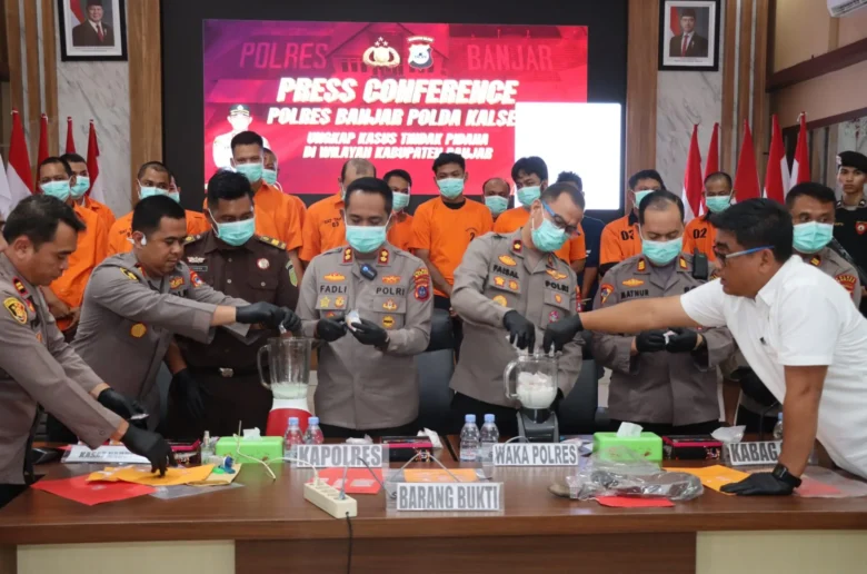 MARTAPURA, kontenborneo.com – Dalam kurun waktu dua pekan terakhir, Polres Banjar Polda Kalsel berhasil mengungkap 10 kasus tindak pidana di wilayah Kabupaten Banjar. Dalam Press Conference yang digelar pada Rabu (07/05/2025) pagi, Kapolres Banjar AKBP Dr. Fadli, S.H., S.I.K., M.Si., membeberkan bahwa 8 dari 10 kasus tersebut merupakan kasus Narkotika, sementara 2 lainnya adalah tindak pidana penganiayaan.
