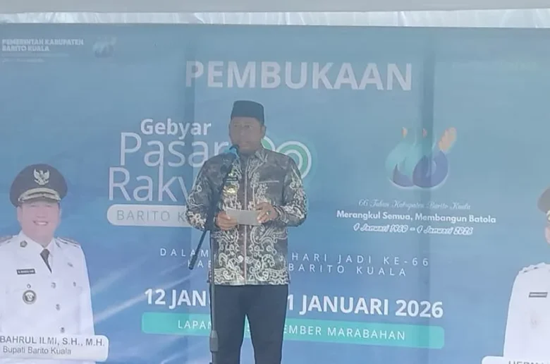 MARABAHAN ,kontenborneo– Bupati Barito Kuala (Batola), H. Bahrul Ilmi, resmi membuka gelaran Pasar Rakyat di Lapangan 5 Desember Marabahan, Senin (12/01/2026) sore. Selain memeriahkan Hari Jadi ke-66 Kabupaten Barito Kuala, ajang ini menjadi langkah strategis pemerintah daerah untuk memperkuat sektor ekonomi kerakyatan.